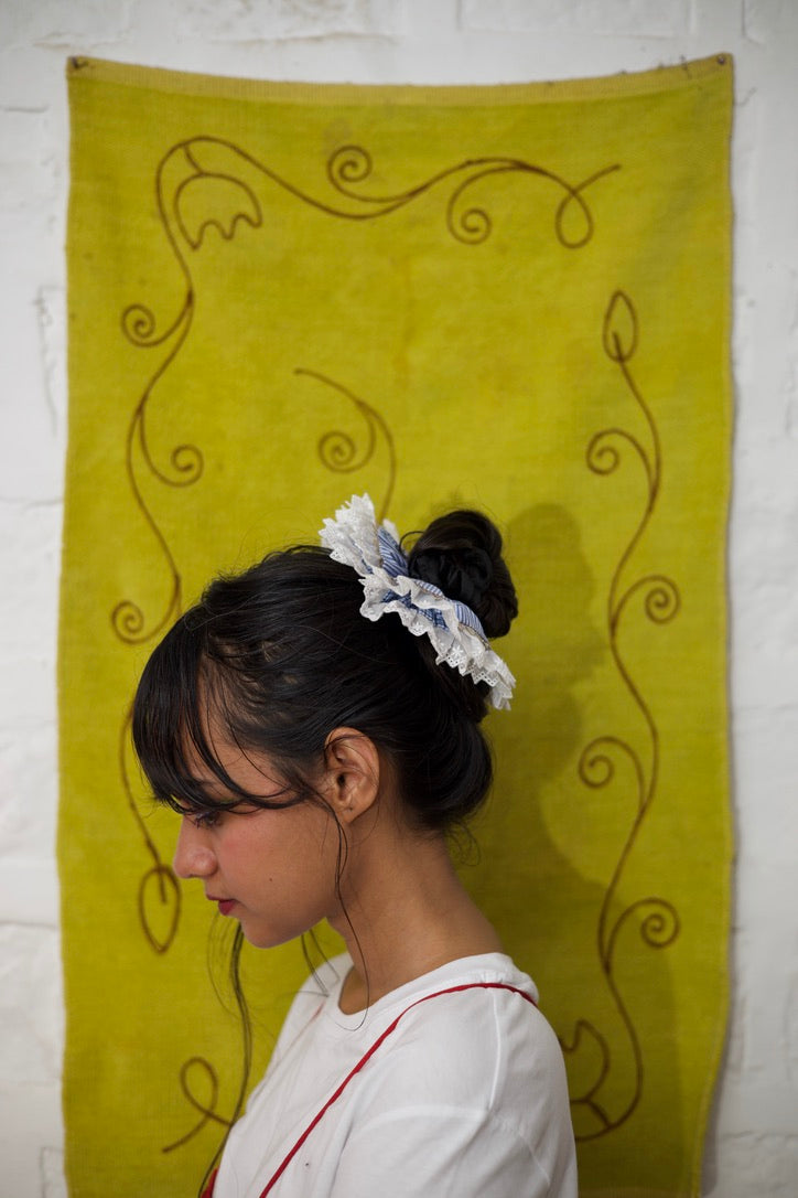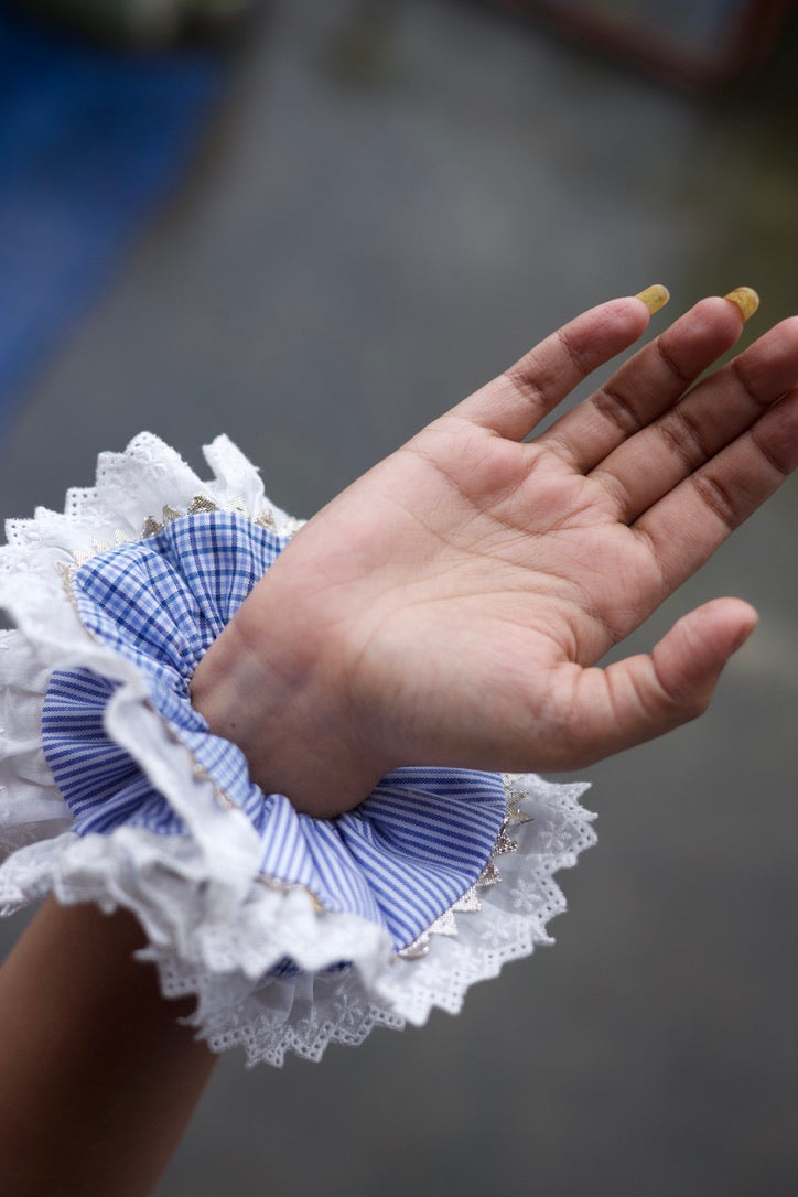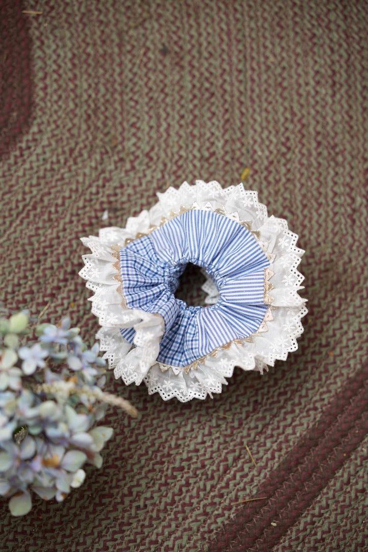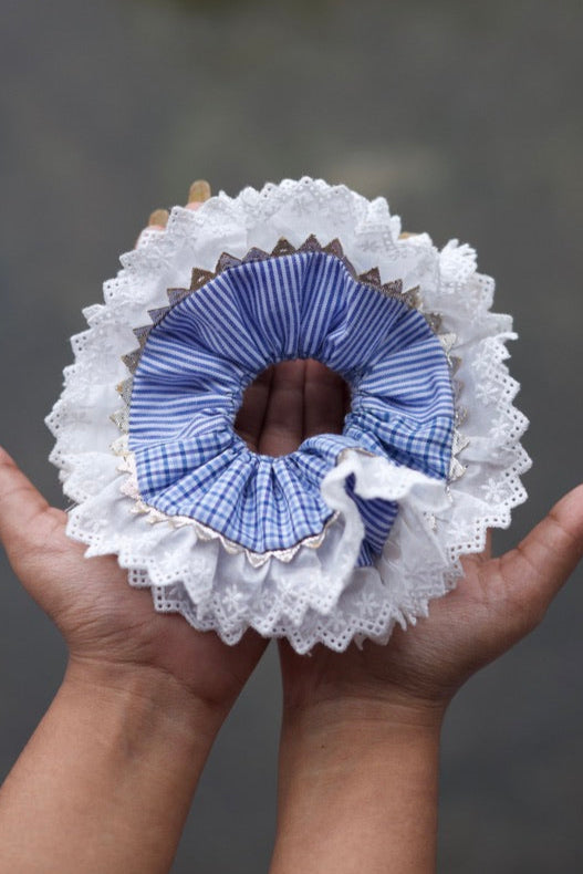 A luxurious handcrafted scrunchie in soft blue with delicate metallic lacing, embodying Claudia Bridgerton's romantic elegance and gentle refinement, by mixing checks and stripes