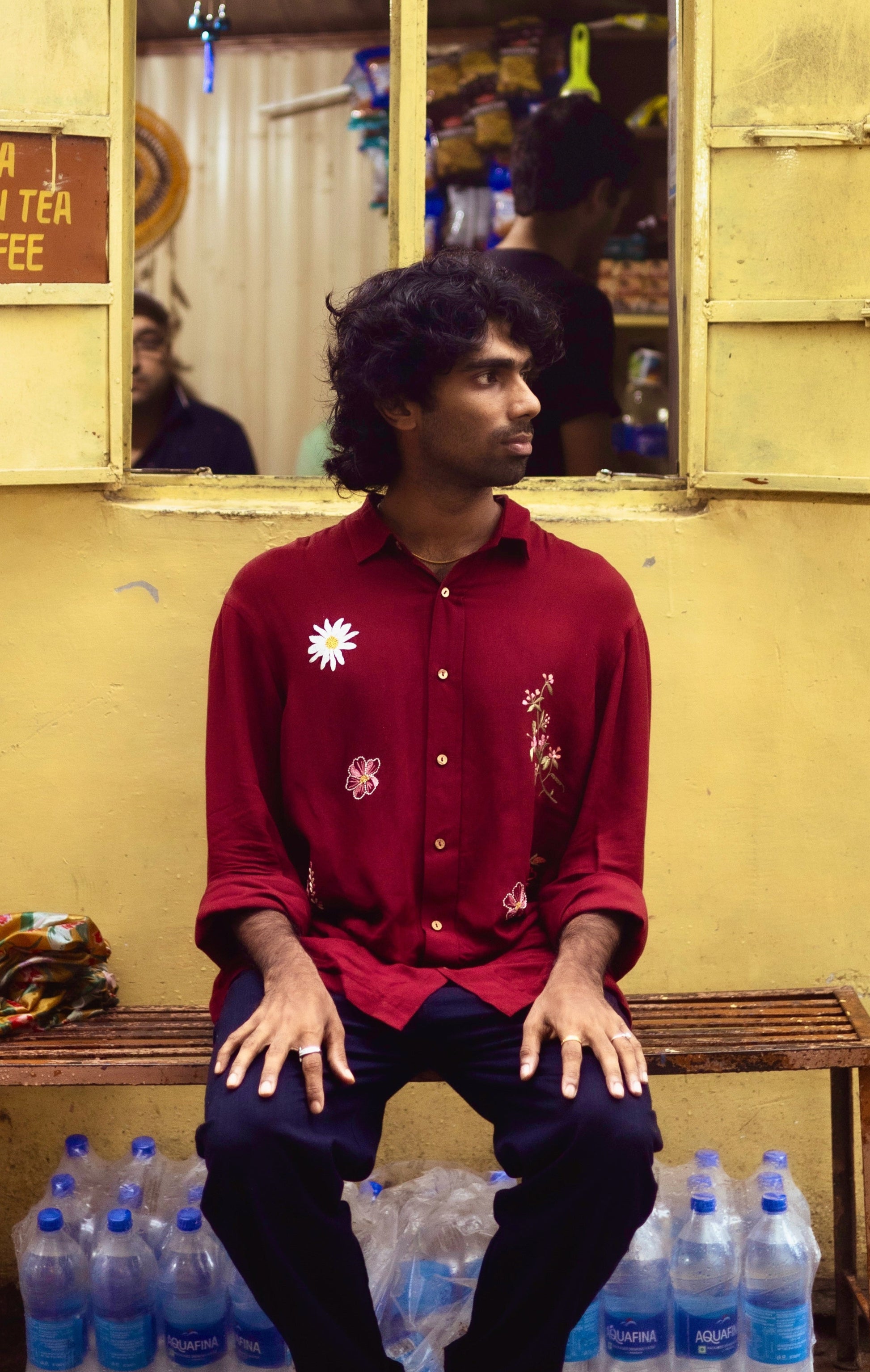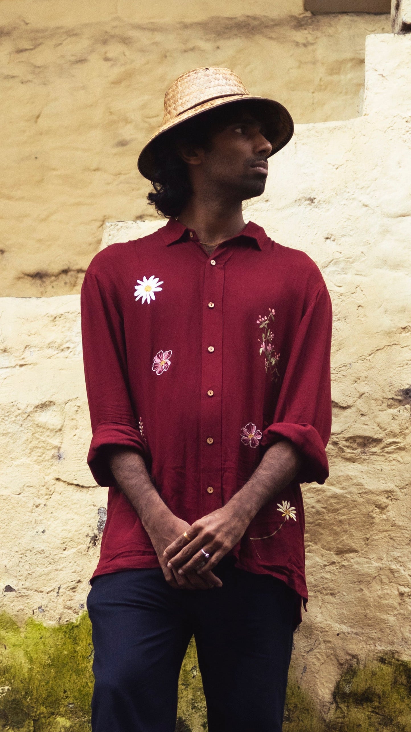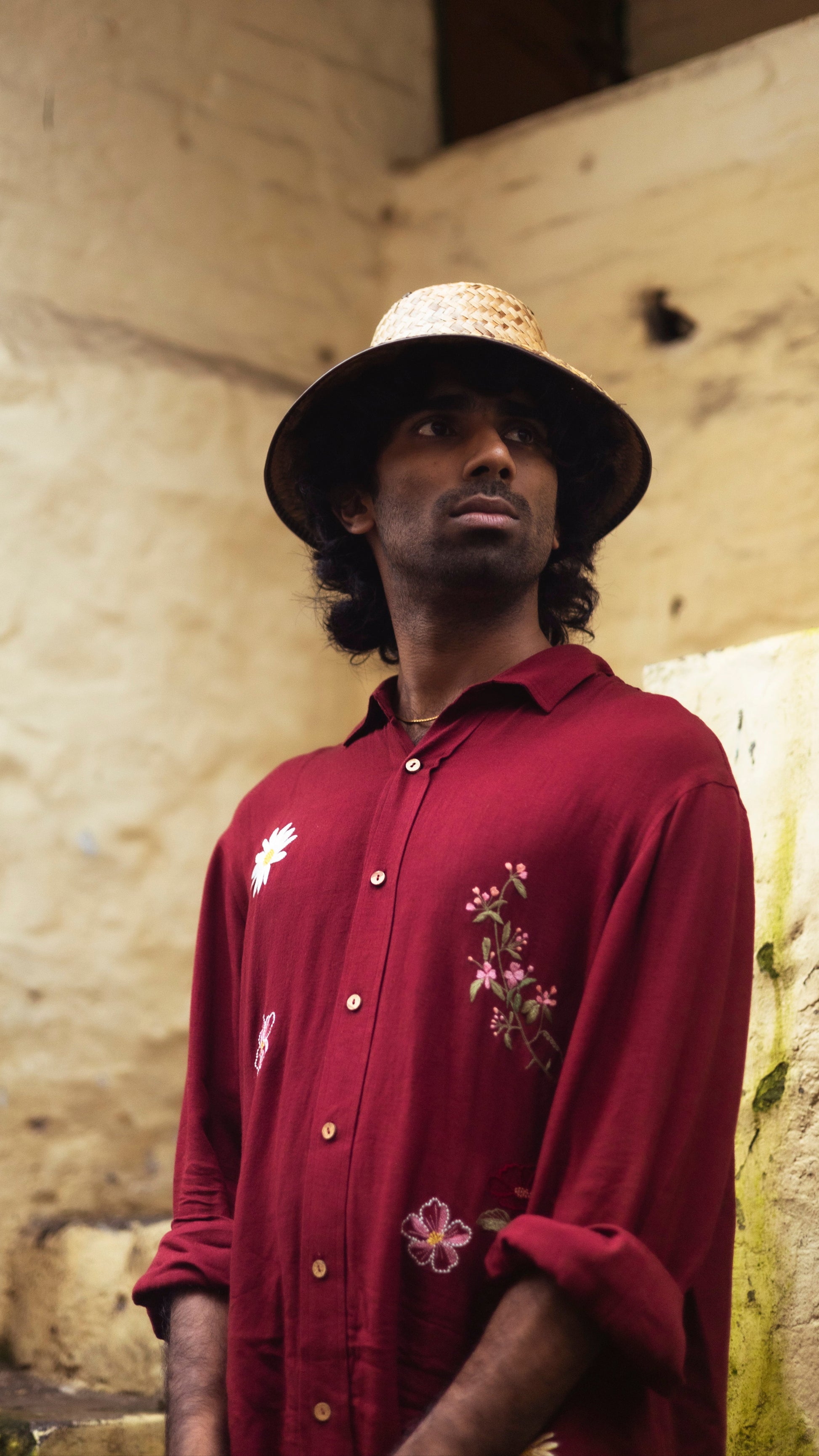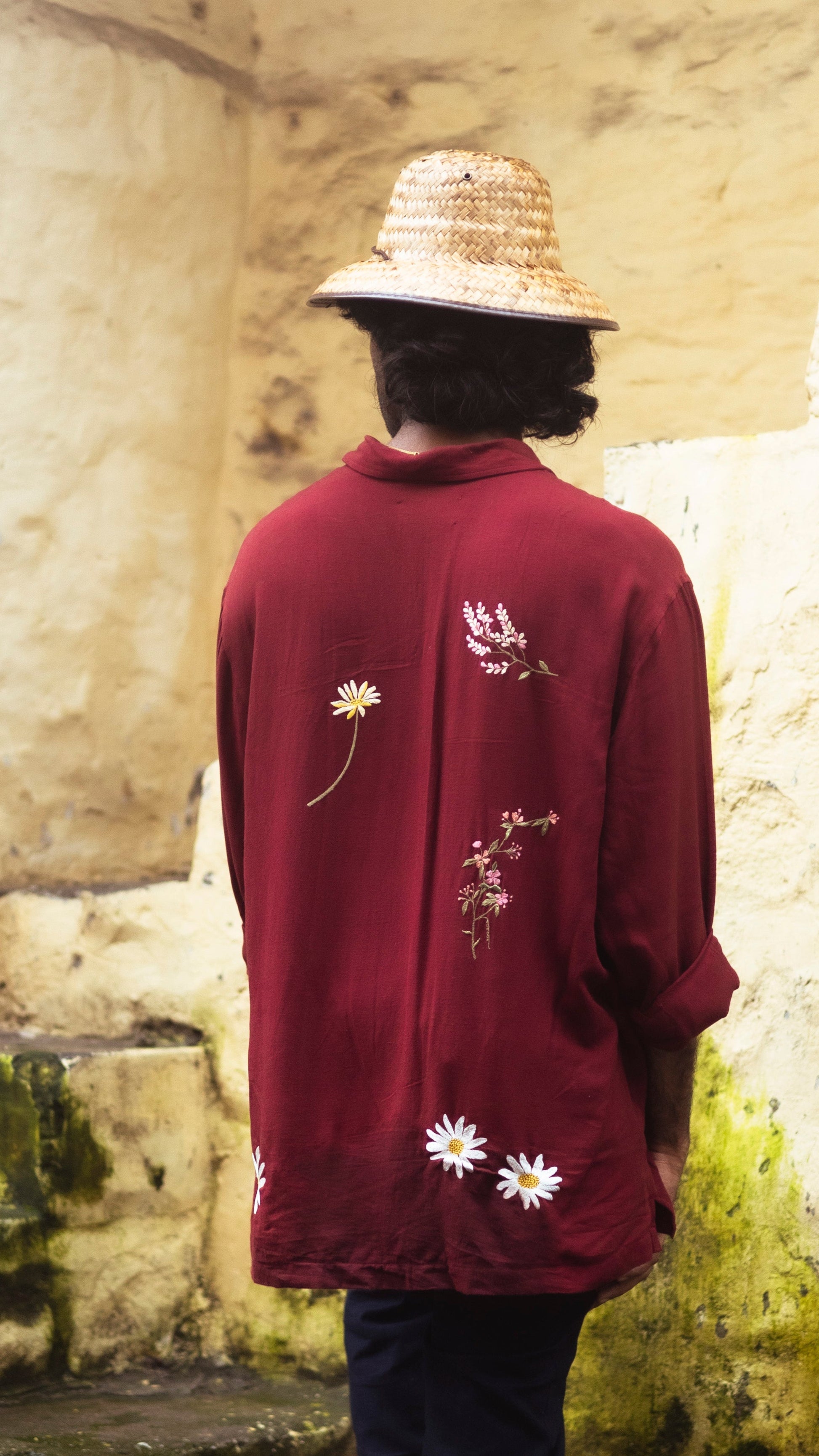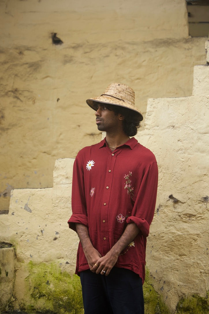 This shirt is inspired by the wildflowers of Himachal that grow in spring, that I had doodled in my stay. These lesser talked about wildflowers in the books are the first to greet you in spring in the hills! The shirt is dyed in a hue of maroon reminiscent of the monastic drapes of the Buddhist monks.