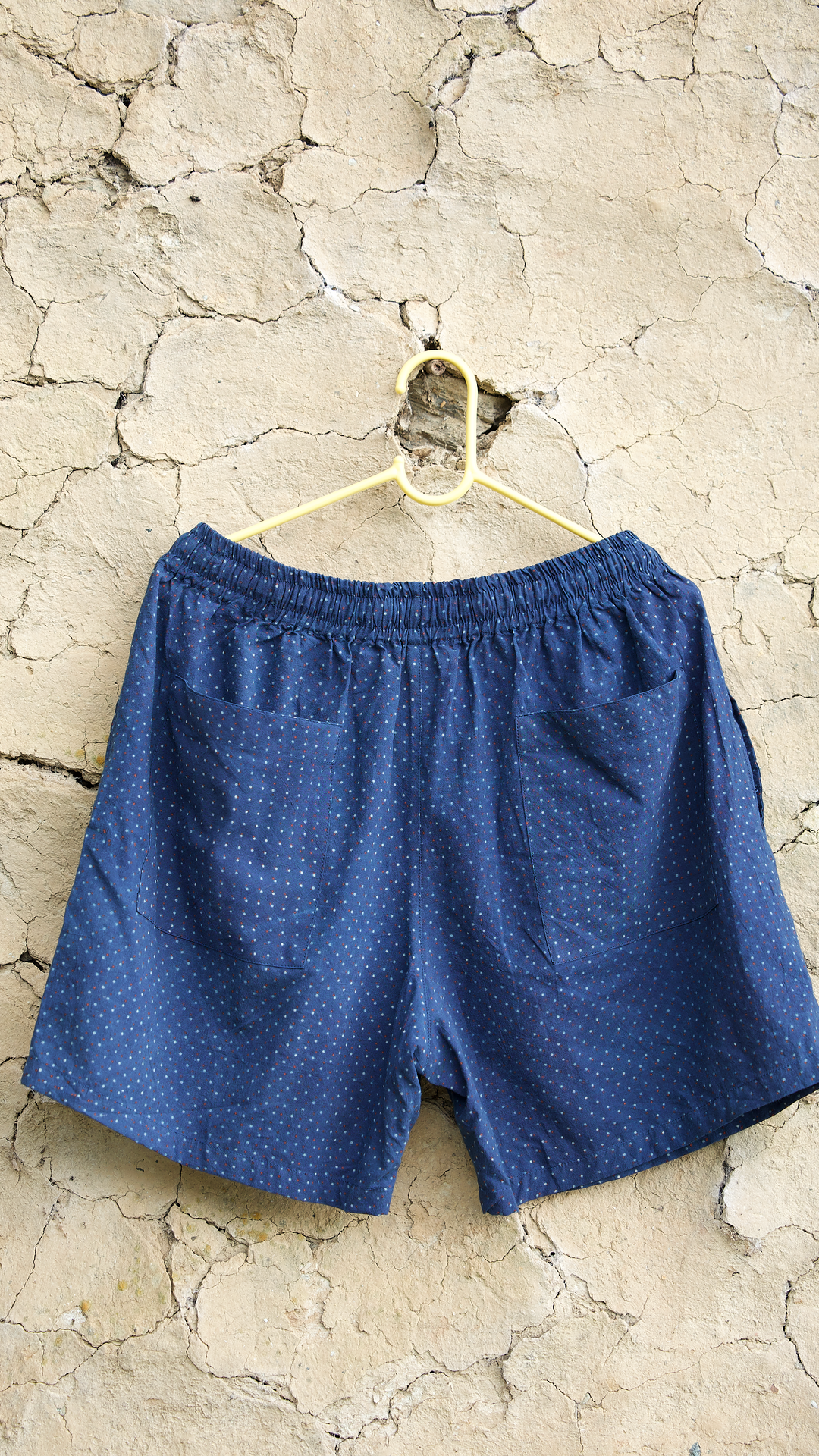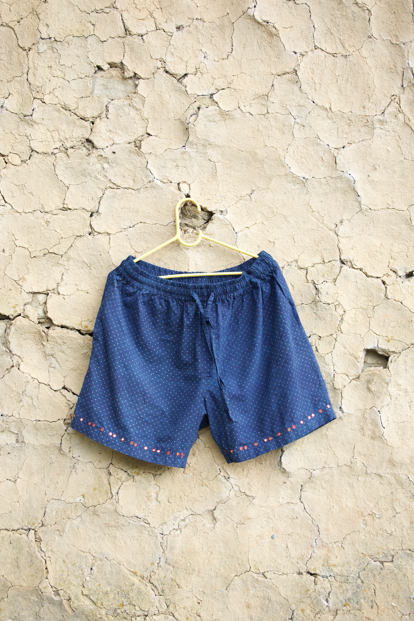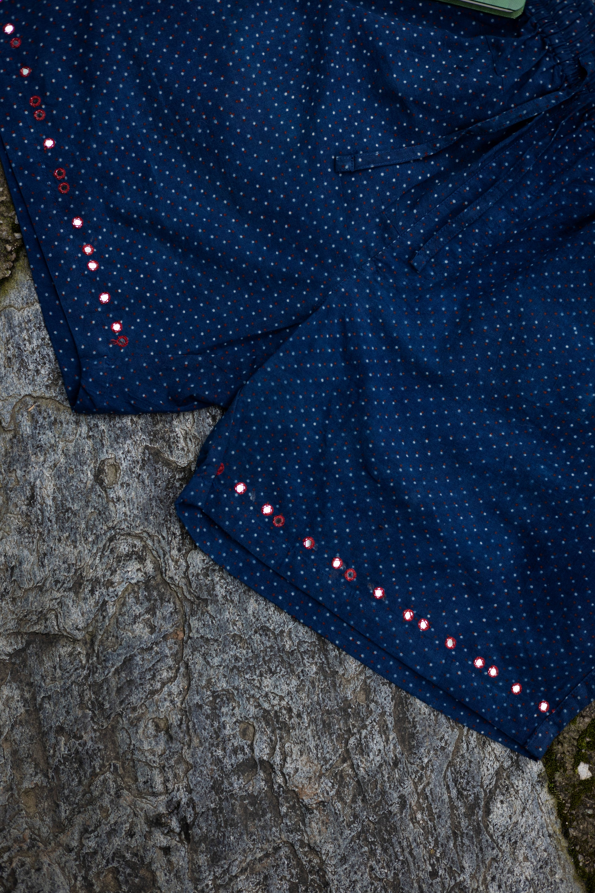 Ajrakh short handblock printed, Indigo dyed with mirror work. This short is born in an desert that turned blue with Indigo. The galaxy short is a block printed and indigo dyed from Ajrakhpur. Ajrakh is a traditional form of block printing and dyeing, primarily practiced in the Kutch region of Gujarat. The term “Ajrakh" is believed to come from the Arabic word "Azrak," which means blue, a dominant color in the craft.