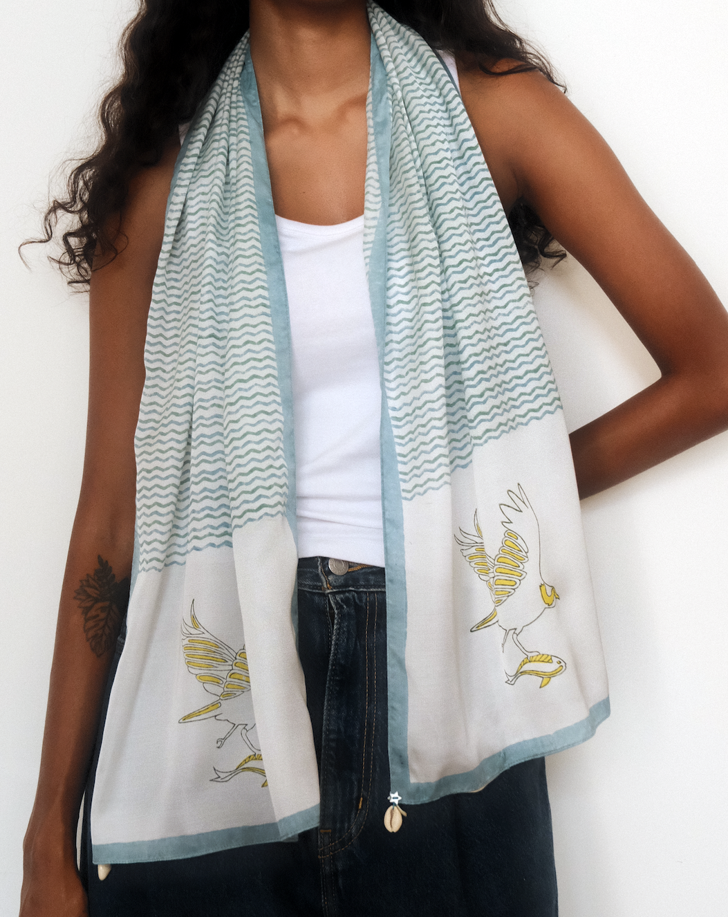 Embrace the tranquility of nature with our Lake Bird Stole, inspired by the picturesque Lake Chilika. Featuring a block-printed design of a bird by the lake, this stole adds a serene touch to any outfit. Perfect for beach vacations.